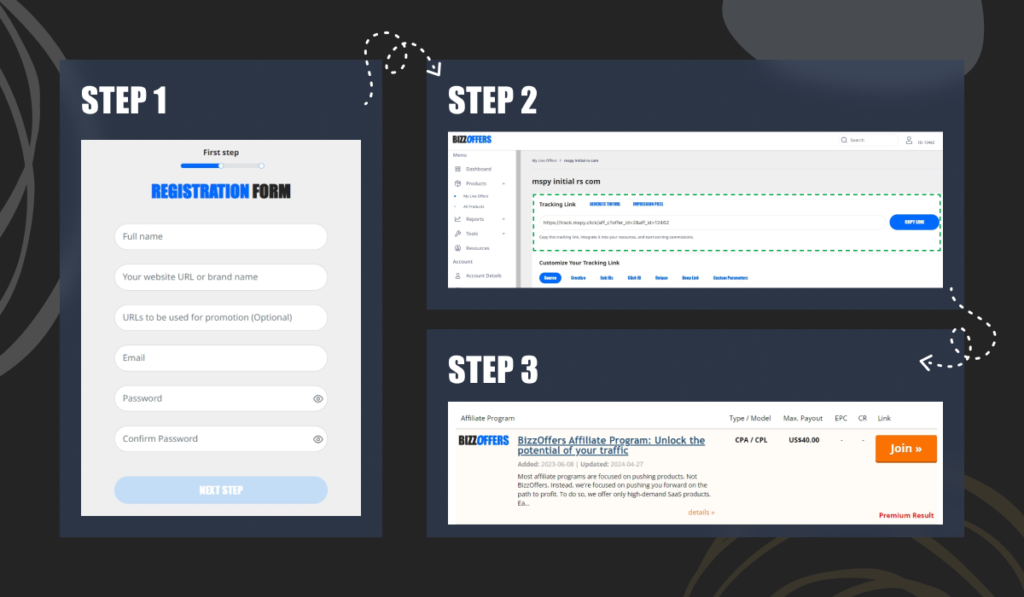 Head over to the BizzOffers platform and register as an affiliate. The signup process is streamlined and can be completed in as little as 45 seconds.